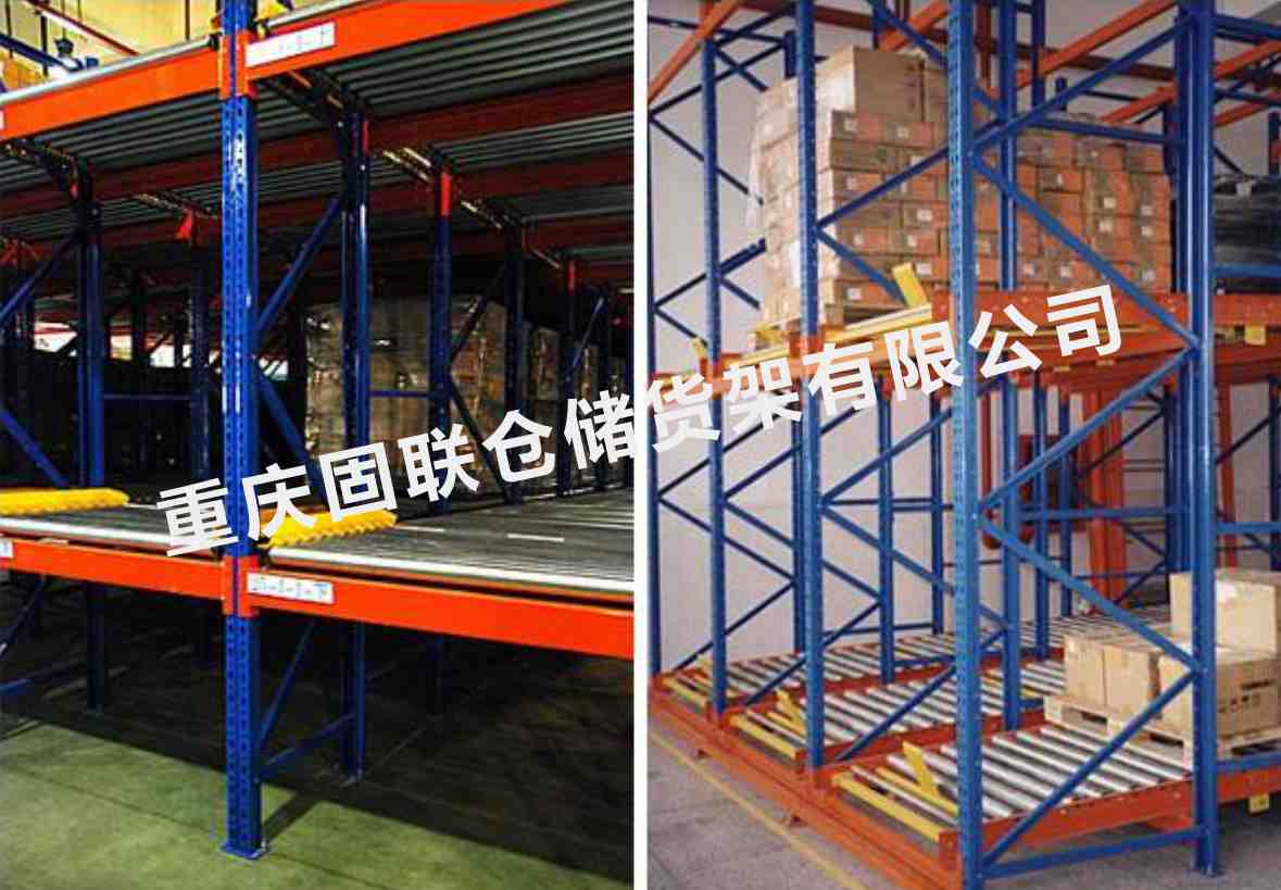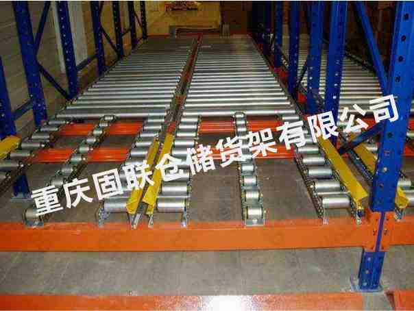 重力式貨架又叫輥道式貨架,屬于倉儲貨架中的托盤類存儲貨架。重力式貨架是橫梁式貨架衍生品之一,貨架結構與橫梁式貨架相似,只是在橫梁上安上滾筒式軌道,軌道呈3-5°傾斜。托盤貨物用叉車搬運至貨架進貨口,利用自重,托盤從進口自動滑行至另一端的取貨口。重力式貨架屬于先進先出的存儲方式。